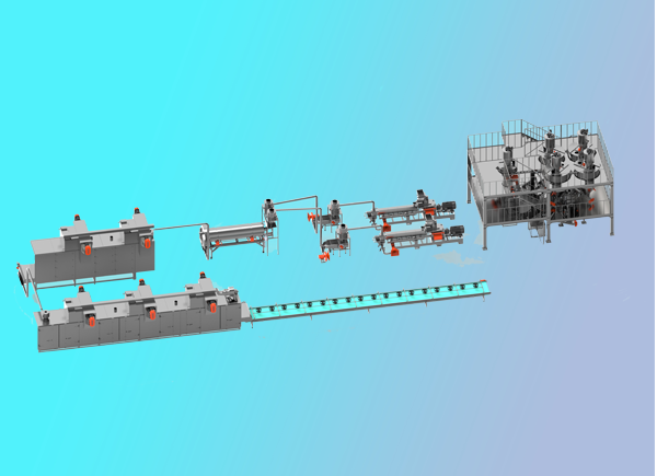 粉碎機(jī)→ 攪拌機(jī)→ 飼養(yǎng)員→ 擠出機(jī)→ 振動(dòng)篩→ 鼓風(fēng)機(jī)→ 多層烤箱→ 冷卻輸送機(jī)→ 包裝機(jī)