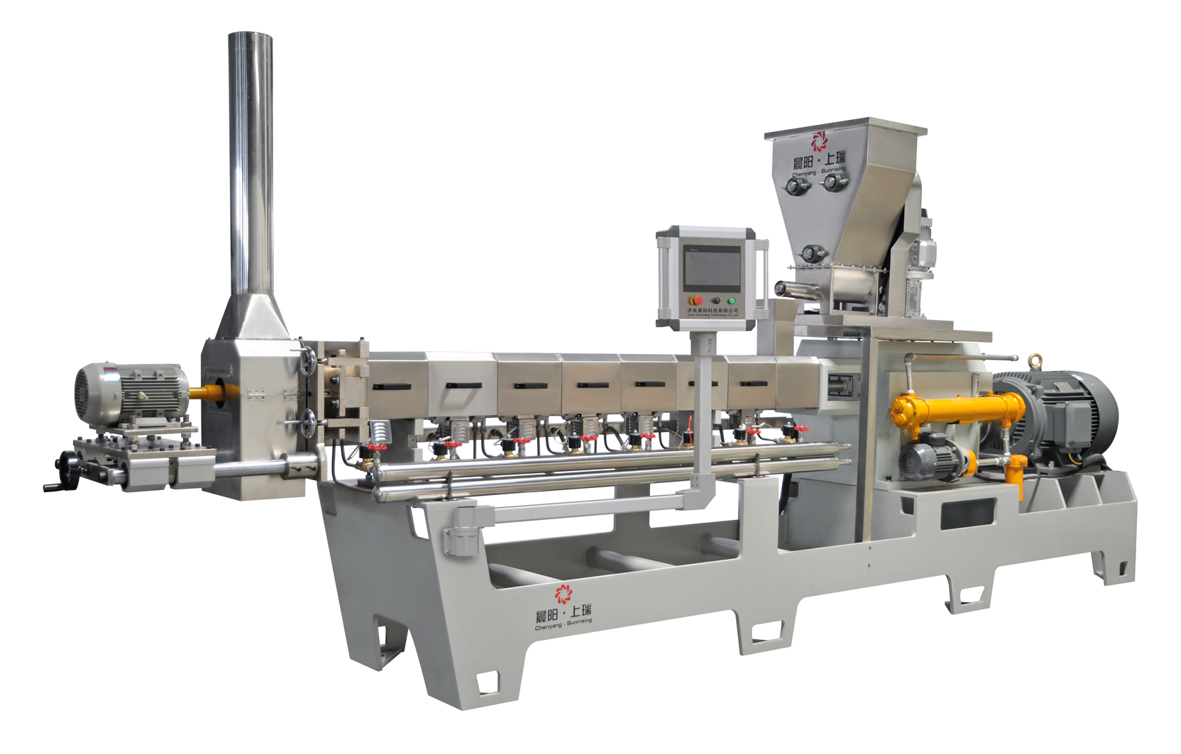 膨化機(jī)的工作原理其實(shí)也比較簡(jiǎn)單,在膨化機(jī)概述中我們講到過,膨化機(jī)是利用機(jī)械能轉(zhuǎn)熱能來提供動(dòng)能的,通常是利用膨化機(jī)的不等距非標(biāo)準(zhǔn)螺旋系統(tǒng)的擠壓推進(jìn),物料中的氣體被排出,并迅速被物料填充,物料受剪切力作用而產(chǎn)生回流,使機(jī)膛內(nèi)的壓力增大,之后同時(shí)機(jī)械能通過物料在膛內(nèi)的磨擦作用而轉(zhuǎn)化為熱能,使物料成為具有流動(dòng)性質(zhì)的膠凝狀態(tài),物料被擠壓到出口時(shí)壓力由高壓瞬間變?yōu)槌?,由高溫瞬間變?yōu)槌?,造成水分迅速地從組織結(jié)構(gòu)中蒸發(fā)出來,隨著摞旋與機(jī)膛間的磨擦使物料充分混合、擠壓、加熱、膠合、糊化而產(chǎn)生組織變化,原有的結(jié)構(gòu)受到破壞,使其內(nèi)部形成無數(shù)微孔結(jié)構(gòu),再通過切割裝置,切割冷卻即膨化食品就成形了。