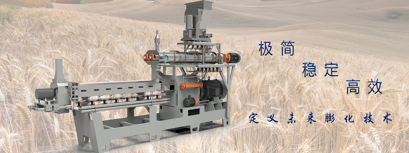 食品原料由喂料器均勻的送入擠壓機的擠壓腔內(nèi),擠壓腔的空間容積沿物料前進方向逐漸變小,物料所受到的擴壓力逐漸增大。同時,物料在擠壓腔內(nèi)的移動過程中還伴隨著強烈的剪切、揉搓與摩擦作用。有時,根據(jù)需要還可通過在膨化腔外加裝電加熱片輔助加熱,這樣共同作用的結(jié)果,使物料溫度急劇升高,物料中的淀粉隨之糊化。整個物料變成熔化的塑性膠狀體。到物料從擠出??着懦龅乃查g,壓強驟降,水分迅速變成蒸汽而增大體積,使物料體積迅速膨脹,水蒸氣進一步蒸發(fā)逸散而使物料含水量降低,同時溫度也很快下降。物料隨即凝結(jié),并使凝結(jié)的膠體物料中呈許多微孔。連續(xù)擠出的柱狀或片狀膨化產(chǎn)品經(jīng)旋轉(zhuǎn)切刀切斷后進行冷卻。