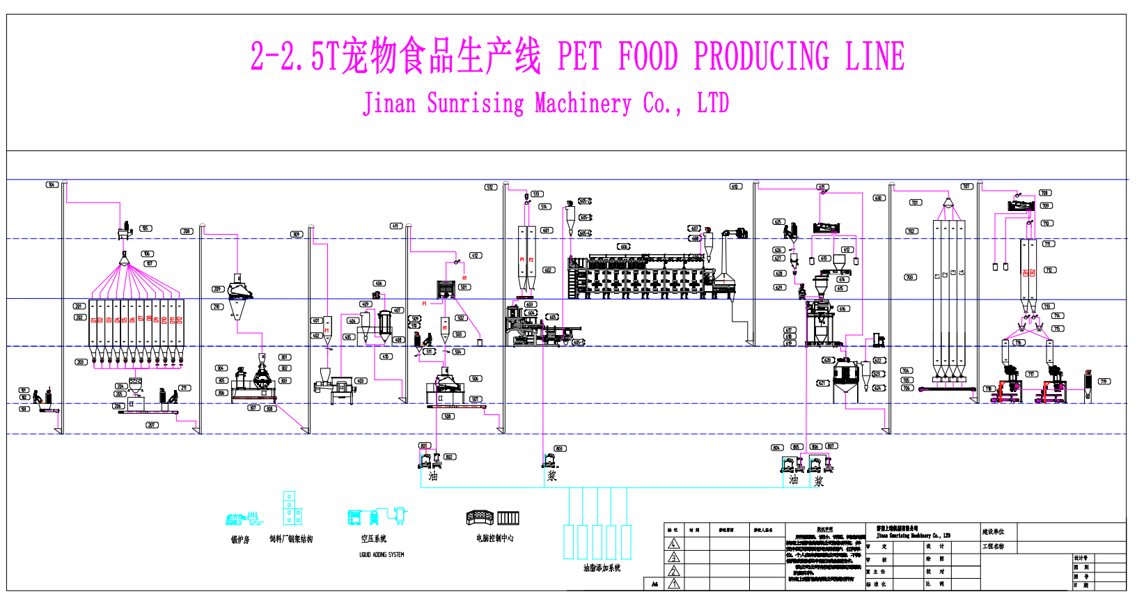 本套2-2.5T/h寵物食品生產(chǎn)線工藝特點,因客戶是空地建設,我司設計首先考慮工藝流程的順暢,在設計上人性化布局,采用4層鋼結構設計,車間建設高度19米(因客戶政府高度限制),工藝方面使用國內(nèi)主流二次混合,二次粉碎、雙螺桿膨化機、真空噴涂、逆流冷卻,產(chǎn)品混色,包裝碼垛等全部自動流水線。配料倉采用12倉,滿足多種配方配料要求,配料軟件采用布勒系統(tǒng)。配料穩(wěn)定,可儲存多種配方,配料記錄可留檔查詢,原料混合使用雙軸漿葉混合機,混合均勻度≥98%,雙軸混合機排料殘留低,可保證每批原料的混合均勻度一致,粉碎機工藝采用粗粉加細粉,批次粉碎。避免不同原料進粉碎機因過篩問題產(chǎn)生沉降層。粗粉碎使用臥室錘片粉碎機,粉碎細度20目,產(chǎn)量高。細粉使用超威粉碎機,刀頭使用鎢合碳化鋼,硬度高。粉碎細度80目過篩率95%。保證產(chǎn)品成型表面光滑,無凹凸顆粒狀。在二次混合添加微量元素和一定比例油脂,提高產(chǎn)品油脂含量。膨化機使用雙螺桿膨化機,產(chǎn)品穩(wěn)定,烘干使用帶式低溫干燥,微量元素熱損低,噴涂使用真空噴涂,油脂添加30%。使用翻板逆流冷卻器,冷卻效果好,配置4倉暫存?zhèn)},可以存儲4種不同顏色的產(chǎn)品,每個倉存儲可以到6個小時膨化產(chǎn)能的產(chǎn)品。可以同時四個顏色進行混合,包裝方面配置自動打包稱,自動碼垛機,給帶式包裝機,包裝規(guī)格500g-25kg全部實現(xiàn)。