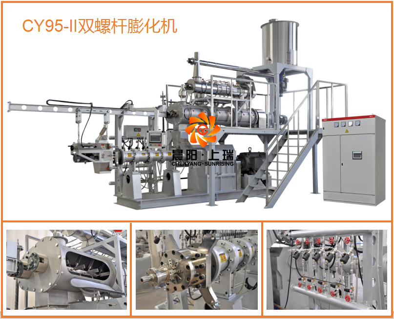 晨陽CY95-II雙螺桿膨化機,主電機搭載110kw,變頻調(diào)速。變速箱使用NSK軸承,南京原裝箱體。使用壽命長,機筒使用45鋼圓形機筒內(nèi)鑲嵌合金襯套,文丘里使用38CrmoaL,螺桿長徑比19.5.整體使用積木組合螺桿,雙頭螺紋,材質(zhì)38CrmoaL。產(chǎn)能2.5T/h,磨損壽命達2萬噸以上,機器良好的齒輪箱和機筒螺桿組合可以保證24小時不停機生產(chǎn)。膨化機喂料方式采用圓盤是破拱喂料器,喂料均勻穩(wěn)定,調(diào)制器使用單軸調(diào)制器加雙軸差速調(diào)制器,調(diào)制效果好,熟化度高,調(diào)制器特別配置鮮肉添加功能,實現(xiàn)鮮肉狗糧生產(chǎn)功能。膨化機使用PLC自動控制,控制機筒溫度和其它電機參數(shù)。調(diào)制器蒸汽、水添加分手動控制和自動控制,自動控制添加可以通過比例調(diào)節(jié)閥實現(xiàn)參數(shù)自由設定化,達到和5-10噸膨化機臺異曲同工之處。