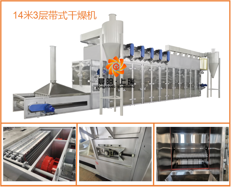 干燥方面,客戶技術指標,成品大于2H/h,脫水率:32%降至5%以內(nèi),對脫水干燥能力具有較高的要求, 晨陽干燥機本次配置14米3層干燥機,帶寬2米,箱室高度達2.4米,通風對流效果好,中間段12米,2米一節(jié)。使用不銹鋼鏈板網(wǎng)帶,使用壽命長,鏈板基本上沒有維修率,鏈板沖孔方式使用晨陽設計的新技術,透風性好,支撐能力強,托料能力強。一平方承載22.5-35公斤物料。3層鏈板獨立變頻調(diào)速,烘干停留時間30-90分鐘。2段控溫,自動比例調(diào)節(jié)閥。蒸汽加熱,使用碳鋼無縫管鋁翅片,散熱好,能源利用高,獨立變頻的排濕系統(tǒng),濕度數(shù)顯,數(shù)據(jù)化操作。出料端設計3米強制冷卻段,迅速降低顆粒表面溫度。確保在后端噴涂前工藝緩沖倉不會因溫度過高產(chǎn)生熱汽結團