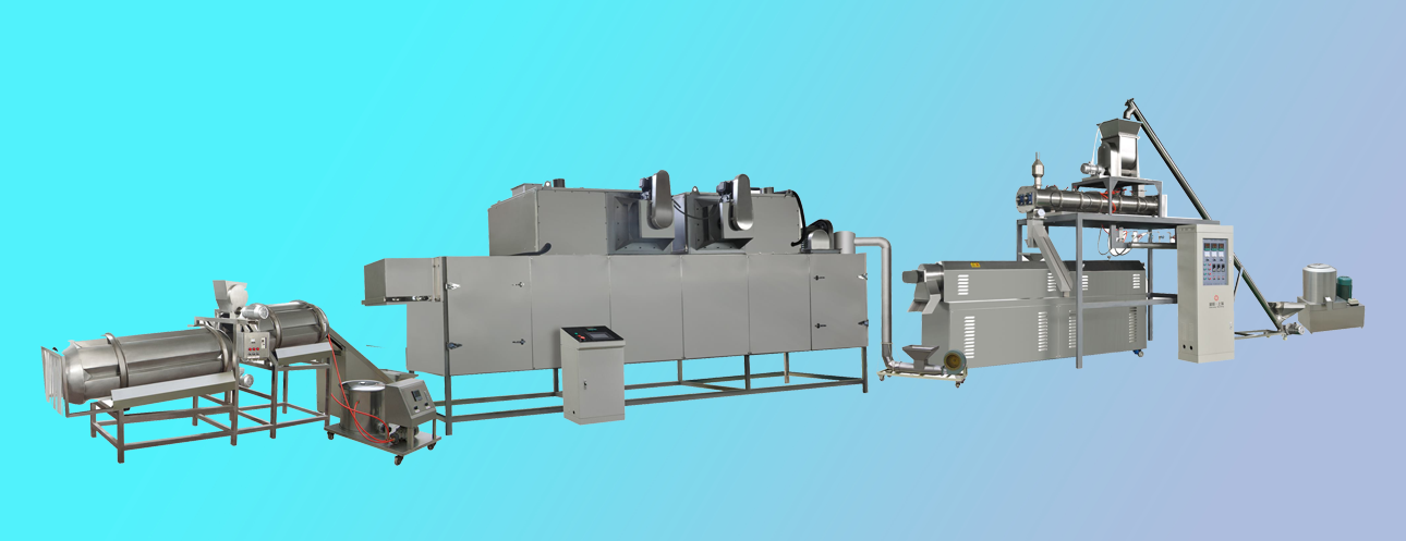 拌粉機(jī)→螺旋上料機(jī)→(調(diào)制)雙螺桿膨化機(jī)→風(fēng)送機(jī)→多層烘干機(jī)-滾筒噴油機(jī)