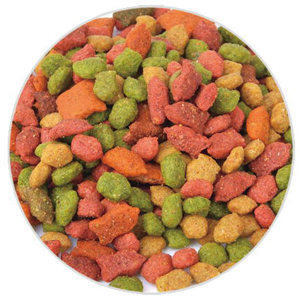 工藝方面寵物食品生產(chǎn)技術(shù)可將客戶(hù)的配方的體現(xiàn)在產(chǎn)品的形狀、大小、適口性、膨化度以及水分含量等,并可按照客戶(hù)要求著色、噴油、噴漿、噴粉以及成品自動(dòng)混色(料)。