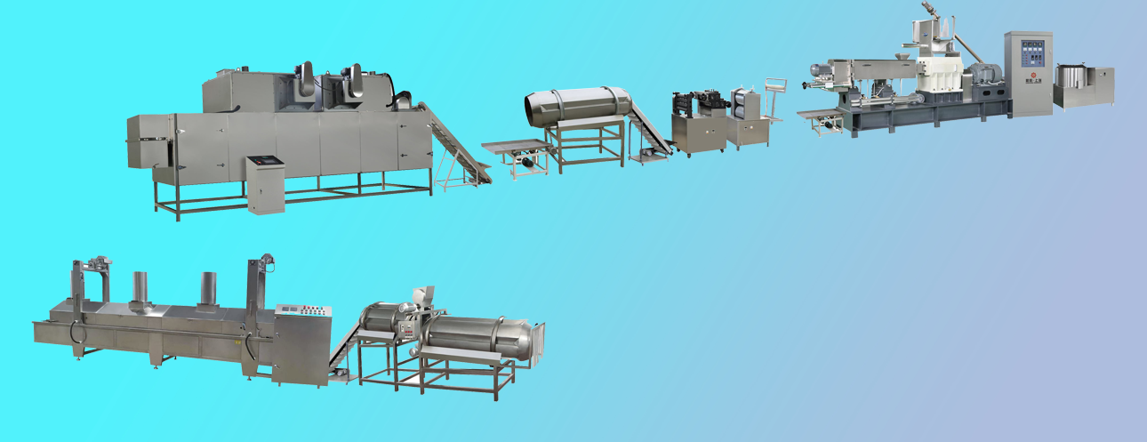 拌粉機(jī)→真空上料機(jī)→雙螺桿膨化機(jī)→展平冷卻機(jī)→整形切斷機(jī)→提升機(jī)-篩選機(jī)-提升機(jī)-八米五層干燥機(jī)-油炸機(jī)-震動(dòng)脫油機(jī)-單滾筒調(diào)味機(jī)