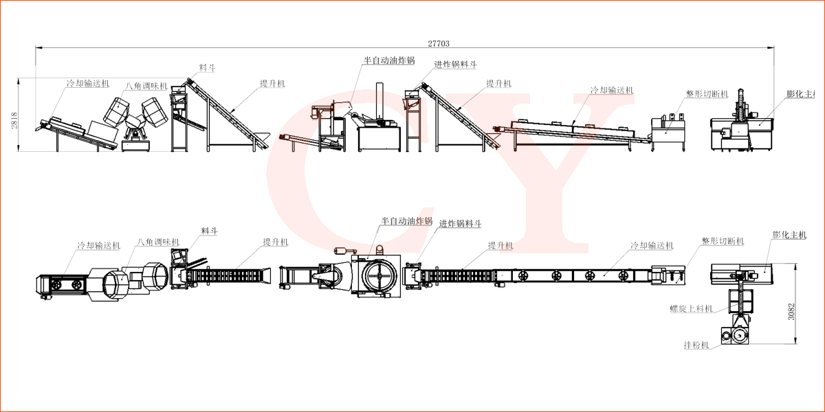 原料混合-膨化--整形切斷-油炸-噴油調(diào)味-冷卻-包裝