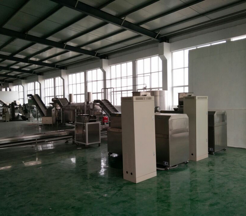 拌粉機→螺旋上料機→雙螺桿膨化機→整形切斷機→輸送機→提升機-稱斗-