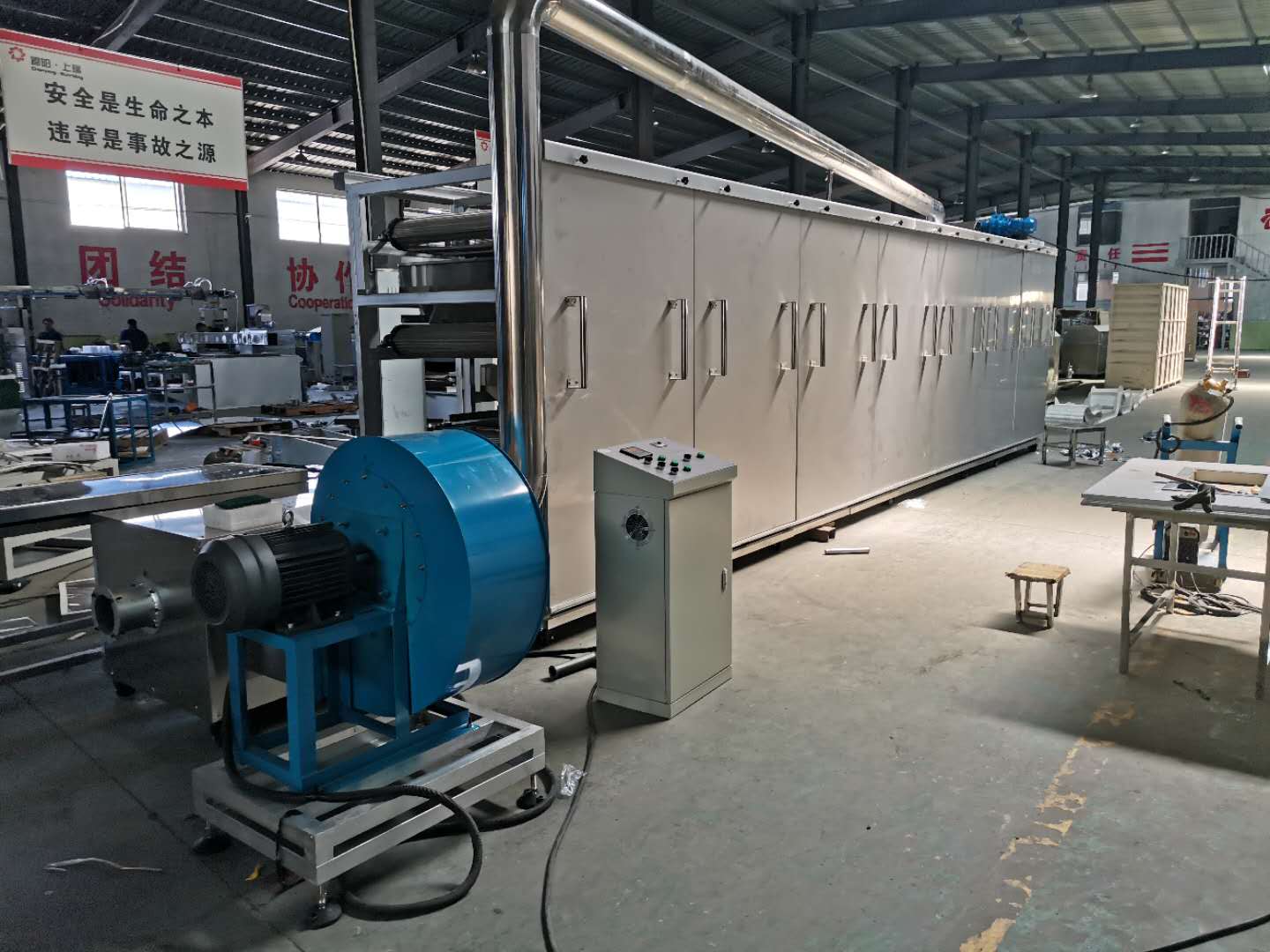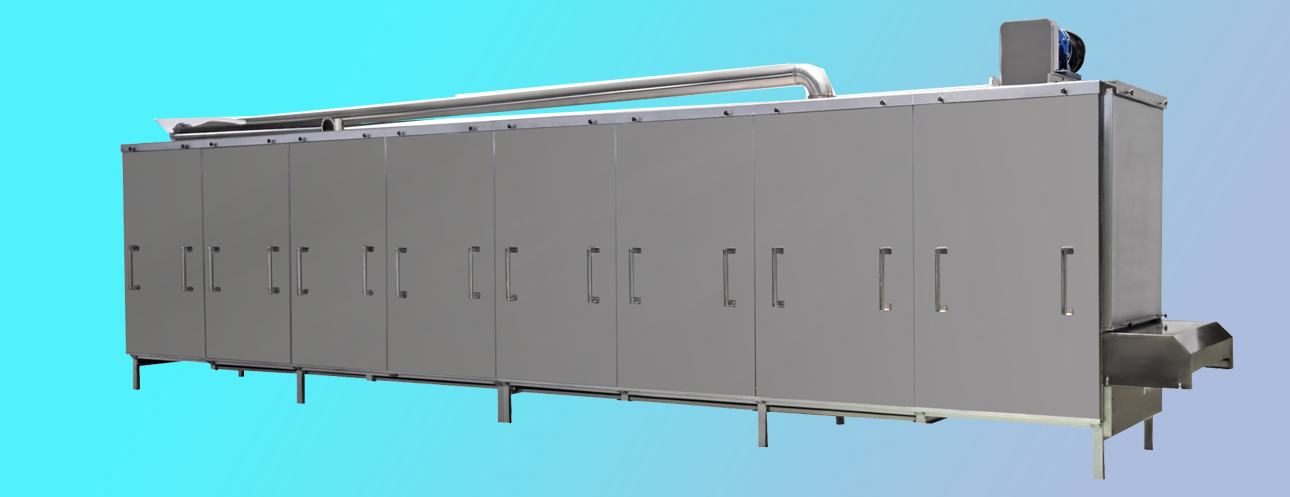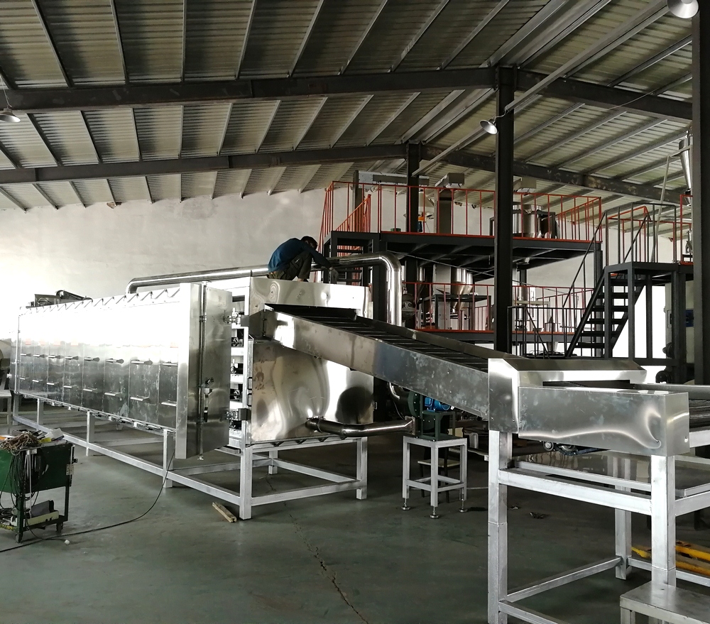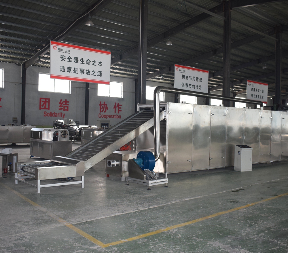 烤箱上料方式:可以直接選用帶爬坡結(jié)構(gòu)和外部借助輸送機送入烘干機料床,直接爬坡的烘干機結(jié)構(gòu)可以更直觀的觀測到物料布料狀況,多用于產(chǎn)量較大的生產(chǎn)線;借助外部上料的烤箱占地面積小,安裝方便,多用于單臺膨化主機的生產(chǎn)線配置